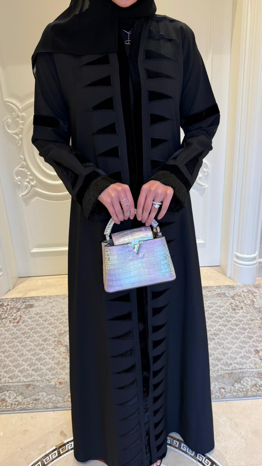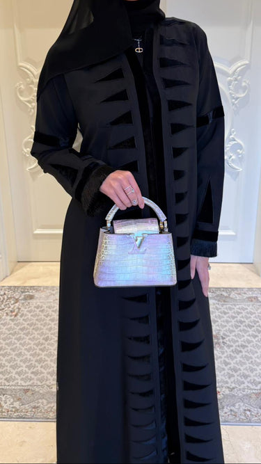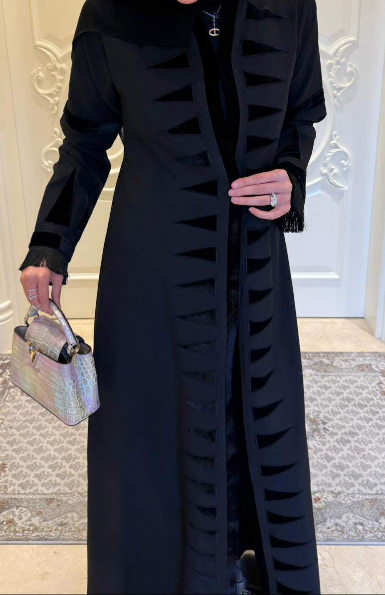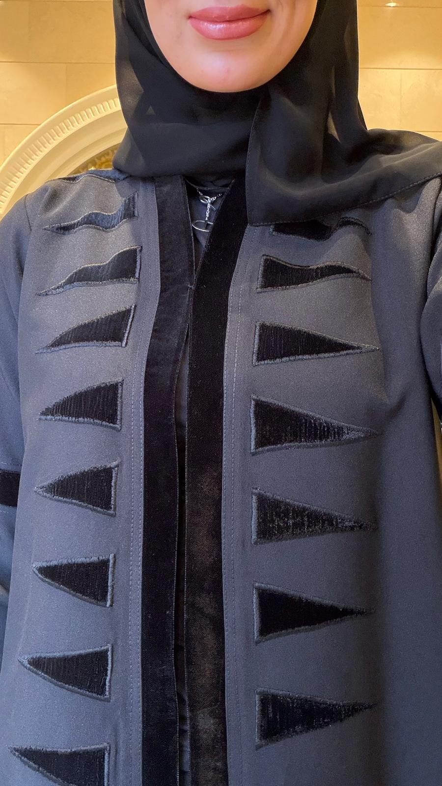 Make a bold, geometric statement. This abaya features a modern graphic print of gray and black triangles for a confident, urban edge.